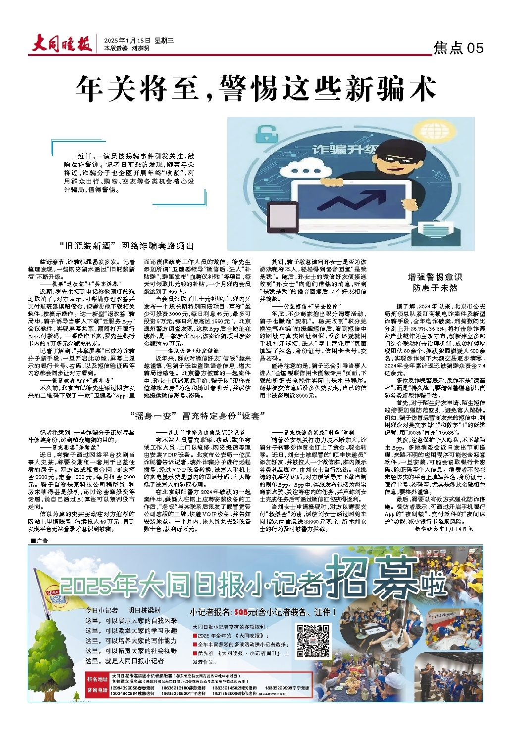 ~~~近日,一演员被拐骗事件引发关注,敲响反诈警钟。记者日前采访发现,随着年关将近,诈骗分子也企图开展年终“收割”,利用群众出行、购物、交友等各类机会精心设计骗局,值得警惕。