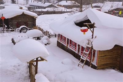 在雪乡漫步,感觉就是在童话世界里行走,那些矮矮的木头房子盖着厚厚的积雪,门前粗短的木桩上落了雪,像欹倒的雪蘑菇。阳光下那些木篱笆的影子拉得长长的,像有意画上去的,特别精致。更让人眼前一亮的是家家窗前都有几串黄玉米。几盏红灯笼上积了雪,更映得灯笼鲜亮。最让人惊叹的是房顶上的雪,差不多有三四十公分厚,云絮一般,又如满满的羊脂,大大方方地到处铺陈,一点不知吝惜。