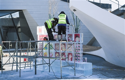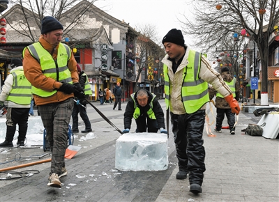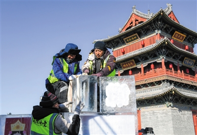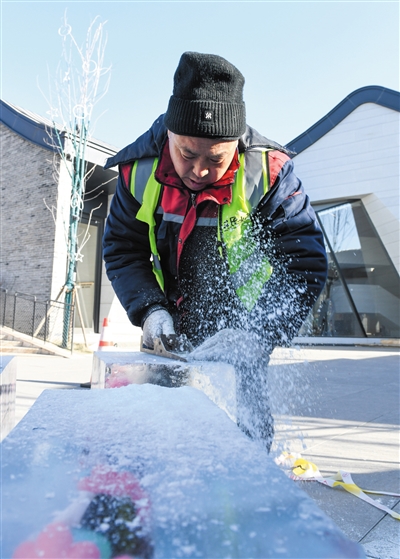 15日,记者在古城内太平楼东南角看到,工人师傅们正紧张有序地将冰封佛小伴砌成冰墙。现场施工的师傅告诉记者,最底层的冰块摆放至关重要。选冰块、切割、砌冰墙……师傅们使用水平仪反复测量,确保每一块冰都处于同一水平面。在冰块的拼接处,师傅们均匀地涂抹上一层薄薄的水,使冰块间紧紧粘连。每砌一层,师傅们都会用冰铲修整冰块的边缘。冰雕制作收尾阶段,师傅们会手持电加热铝板,自上而下轻轻“熨烫”冰面,刹那间,冰面变得光滑如镜、晶莹剔透,将冰雕的美感展现得淋漓尽致。