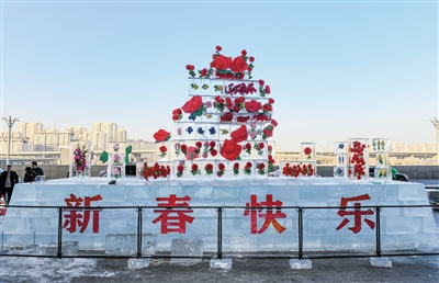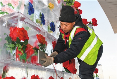 “上车的饺子,下车的面”,传统民俗以冰雕形式呈现。在大同南站出站口,2座冰雕已完工,冰块中包裹着造型可爱的面条和饺子;在进站口,则是娇艳的冰封玫瑰,供旅客们驻足拍照。