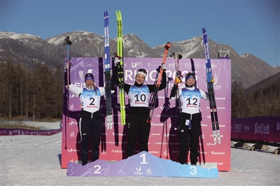 17日,2025年都灵大冬会越野滑雪女子个人短距离(传统技术)决赛在意大利普拉格拉托举行。图为当日,冠军波兰选手伊莎贝拉(中)、亚军爱沙尼亚选手卡西库(左)和季军芬兰选手林德罗斯在比赛后合影。