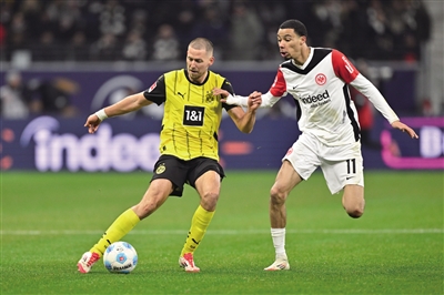 17日,在2024-2025赛季德国足球甲级联赛第18轮比赛中,法兰克福队主场2∶0战胜多特蒙德队。图为当日,法兰克福队球员埃基蒂克(右)与多特蒙德队球员安东在比赛中拼抢。 新华社发