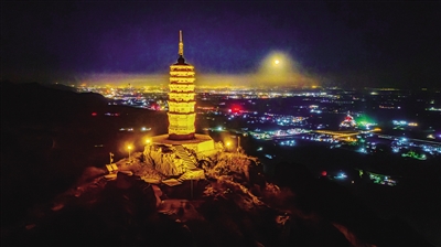 本报讯 (记者 闫昌) 肃穆古朴的佛塔,美轮美奂的灯光,暮色四合时,云冈区西南七峰山丈人峰顶上,禅房寺塔仿佛披上一袭璀璨的华服,与满天星辰共同点亮夜空……1月20日,记者来到这里,已有不少市民和游客驻足观赏,纷纷用手机记录下这美好的时刻,并在社交媒体分享。