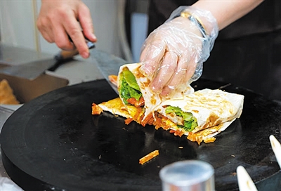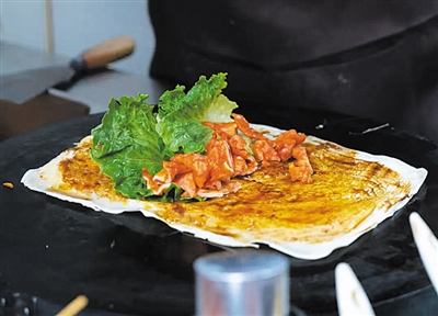 用筷子戳个小口,面皮破开瘪了下去。就在面皮彻底落下的一刹那,又被及时伸出的筷子挑起,从刚破开的小孔中灌入打散的鸡蛋。蛋液还没来得及凝固,便被摊主连带着整个饼翻了个面儿,鸡蛋的香气飘在空气中,相隔数米都闻得到。灌了鸡蛋的饼要来回翻几次,待鸡蛋成熟后刷酱、撒葱花或榨菜碎、放生菜、火腿肠,顺势一卷,一气呵成,一两分钟,饼已被装入纸袋里,递给了等待的人。