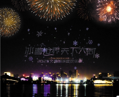 昨晚的文瀛湖畔,大型无人机焰火秀表演异彩纷呈。 本报记者 张占兵 摄