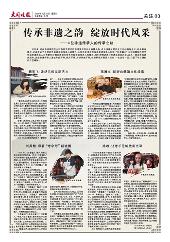 杨雪飞说:“让大同非遗技艺在传承中‘动’起来,是每一位非遗人的责任。既要保留传统技艺,又要有独具特色的艺术创作理念,才能让非遗项目焕发出新活力。”