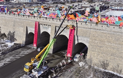 作为2025年大同市迎新春系列文化活动的一项内容,27日,大同古城城门春联悬挂全部完成。