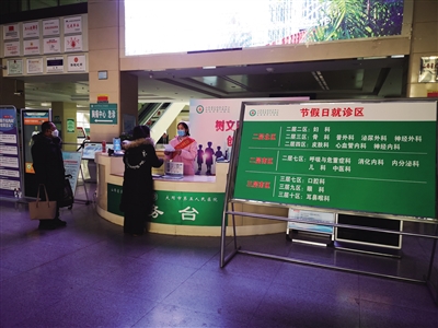 正月初三8时30分许,记者在市五医院看到,门诊楼前悬挂的大红灯笼装点出浓浓的新春气息;大厅内,“节假日就诊区”的标识牌放在了显眼位置,导诊人员热情地为患者提供服务,帮助患者及家属在自助机上挂号、缴费、打印报告单;挂号、缴费、方便门诊、取药等窗口人来人往;各诊区患者有序等候叫号;医学影像科、超声科、检验科等医技科室都有工作人员值守,排队等候的患者较少,几乎是随到随查。