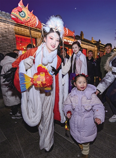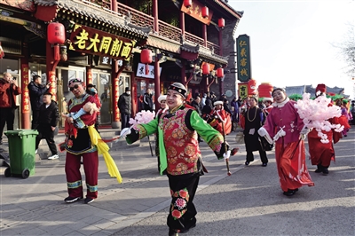 缤纷文化营造出古城的浓郁年味。深街古巷内,社火巡游、过大年唱大戏、群众文化活动、文化IP演绎、市集等活动,让人目不暇接,备感大同历史文化之厚重精深与民俗文化之鲜活生动;东南邑新春年货市集等,带给游客欣然融入的丰富体验;漫步古城,魔术、乐器演奏、传统戏曲角色扮演等,使得古城的文化氛围让人流连忘返。由各县区组织的社火队伍表演,迸发出大同古城红火喧腾的文化活力,在元宵节前夕,这份吉祥美好的大同年味仍在持续升腾,“大同年 大不同”文化活动品牌正火热叫响。