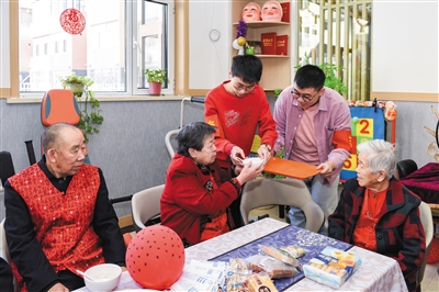 图为志愿者为老人们送上元宵。