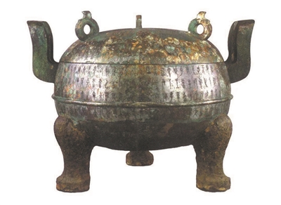 铁足大鼎出土于中山王厝墓西库,同时出土的9件列鼎中,该鼎是首鼎,也是我国迄今发现最大的铁足铜鼎。此鼎通高51.5厘米,最大直径65.8厘米,铜身铁足,圆腹圜底,双附耳,蹄形足,上有覆钵形盖,盖顶有三环钮。鼎的周身刻有铭文469字,共计77行。众所周知,西周宣王的毛公鼎(现藏台北故宫博物院)铭文多达497字,为金文篇长之最。东周晚期进入战国时代,铜器铭文多为短篇,字多者十几个字,少者几个字。“中山三器”却打破了这一纪录,铁足大鼎铭文多达469字,仅次于毛公鼎,创下战国时期青铜器长铭之最。铜鼎铭文,笔画瘦硬劲挺,纤细工致;用笔圆转飘逸,字形修长;结体取纵势,疏朗宽松。从布局看,铭文章法随势附形,排列整齐。另外,铭文线条刻画生动,曲直有度,方圆皆备,显示出得心应手的镌刻技巧,使通篇铭文产生出强烈的韵律感。可以说,“中山三器”中尤数铁足大鼎的铭文最为精美。