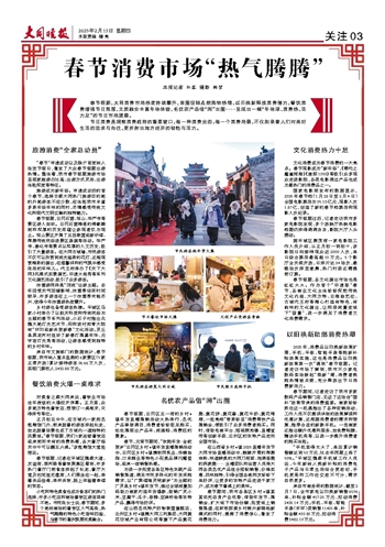 春节假期,大同消费市场热度持续攀升,商圈促销点燃购物热情、以旧换新释放消费潜力、餐饮消费增强节日氛围、文旅融合丰富年味体验、名优农产品借“网”出圈……呈现出一幅“年味浓、消费热、活力足”的节日市场图景。
