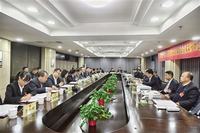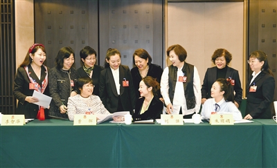 下图 15日,参加市政协十五届四次会议的妇联、青联等界别委员们讨论政府工作报告。 本报记者 于宏 摄