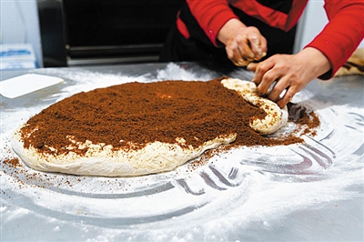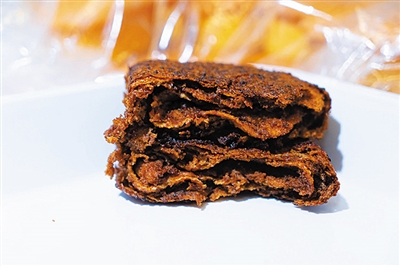 交谈中记者了解到,制作锅盔的面要在前一天晚上发好,“发面得用老面酵,发好的面只兑碱,这样做出的锅盔口感才好。”李师傅先做的是红糖锅盔。将面用手平摊开,在上面铺一层厚厚的红糖。红糖看上去是普通红糖,实则里面按比例混合了面粉和油,这样使得红糖不仅松散不结块,而且很滋润。将铺好红糖的面皮卷起,将其横向一分为二,然后将两条面叠起,稍加整理,再横向一分为二,如此反复两次后,再横向一分为二,这时面的纹理犹如油画一般,浅白、浅黄,渐变为浅巧克力色,直至深琥珀色,有一种美拉德配色的即视感。将面条整理下剂,每一个剂子三两二。尽管李师傅把剂子都要过秤,但每个剂子重量十分精准,不用添加分毫。“干得年长了,手就是秤”,李师傅自豪地说。下好的剂子还要擀开,折叠,再擀开,再折叠,如此反复三次,边擀边撒红糖,最后一次擀成一个正方形,一个饼坯才算完成。饼坯放入烤盘,进入烤箱,20分钟后,锅盔出炉。