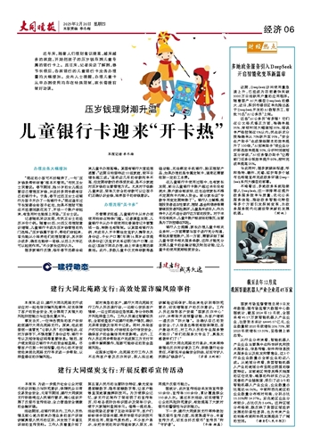 “现在的小孩可不好糊弄了,一句‘压岁钱我帮你存着’根本不管用。”市民王女士笑着说。春节期间,她10岁的女儿提出要自己管理压岁钱,并说好多同学都有自己的银行卡。于是,春节过后王女士在银行为孩子开办了一张银行卡。“现在逢年过节长辈都会给孩子红包,如果不理财可能在不经意间就花完了,开设一个账户存起来,有急用时也能派上用场。”王女士说。