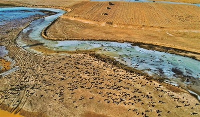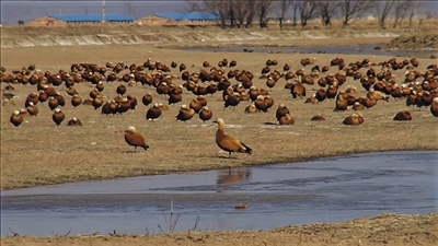 春节过后,随着气温回暖, 阳高县白登河河道冰雪逐渐消融,成千上万只赤麻鸭在解冻的河两岸嬉戏觅食。
