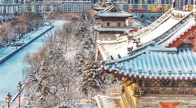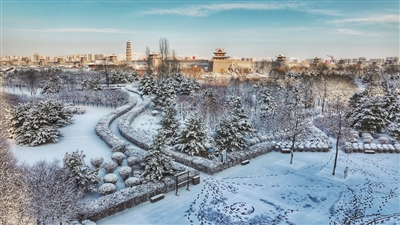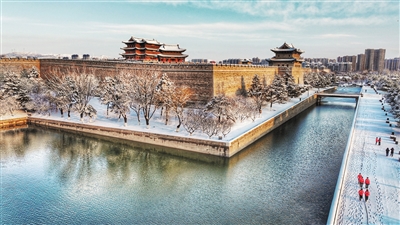 银装素裹,诗意如画。14日晚的一场春雪为大同古城再披银装,随着微露的晨光,古城青砖与琼枝玉树相映成趣,宛如一幅徐徐展开的水墨画,晨练的市民、慢跑的运动者,在城墙边留下串串脚印……古城与自然交融,在天地间绘就了仙人泼墨未干的写意,也成就了摄影爱好者镜头里难得的美景。 本报记者 张占兵 摄