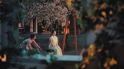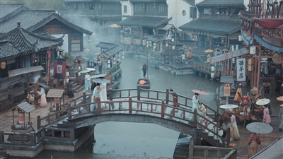 第二,宋代的城市观景具有审美价值。例如,宋代园林数量猛增,艺术更加精细,兼顾山水之趣与日常享受,追求自然美与人工美融为一体的意境。有学者认为,园林在宋代完成了写意化、绘画化和诗化。这一点为影视剧置景提升了美学价值,扩展了叙事空间。近年来,所有宋代古装剧皆有园林场景,以《似锦》为例,姜似、余七的宅院都是园林式造景,对称的门框、交叠的树木,以及小桥流水,利于增加影像的艺术性。