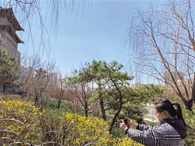 昨日上午,记者前往城墙带状公园看到,在春日暖阳的轻抚下,以雄伟的古城墙、澄澈的大同蓝为背景,一小部分连翘花已经盛开,向外舒展着嫩黄色的花瓣。市民和游客纷纷拿出相机或手机,用光影定格这份美好。