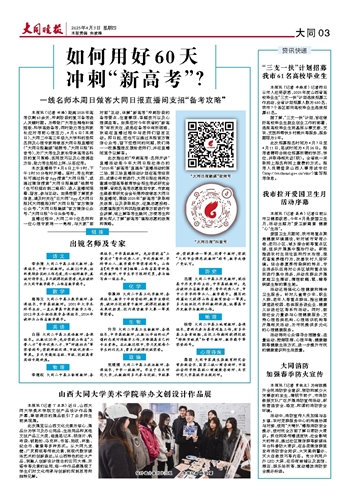 本次直播将于4月6日上午9时、下午2时30分准时开播。届时,考生和家长可通过抖音App搜索“大同日报”,或通过微信搜索“大同日报融媒”视频号(也可扫描右侧二维码),进入直播间观看、留言,参与互动。如果想要了解更多信息,请及时关注“云大同”App、《大同日报》《大同晚报》和“大同日报”官方微信公众号、“大同日报融媒”官方微信公众号、“大同日报”今日头条号等。