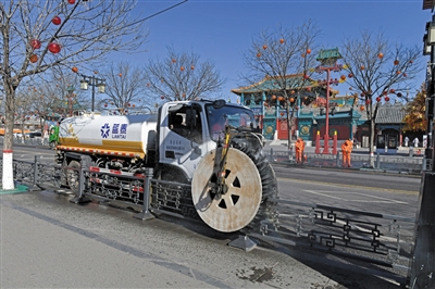 1日上午,记者在大同古城和阳街看到,清洗车快速清洗护栏,环卫工人手持高压水枪将清洗不到的地方进行冲洗,随后人工擦干,洗扫车先清洗路面后将冲洗出来的污水回收,人机紧密配合。