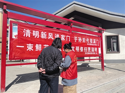 本报讯 (记者 刘剑) 2日,为弘扬文明新风,倡导绿色祭祀理念,云冈区西花园街道桃园社区新时代文明实践站开展“文明追思,平安祭祀”宣传活动,引导居民树立安全、绿色、文明的祭祀观念。
