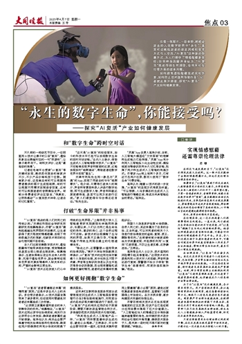 “‘AI复活’技术正在改变人们心中传统的生死界限。”上海师范大学人工智能教育研究院副院长林晓同样表示,长期以来,人们认为死亡是生命体征的消失、意识的消亡,这个自然过程不可逆转。新技术的出现模糊了生与死的界限,如果不正确引导,可能影响基于传统生死观念建立的伦理道德体系。