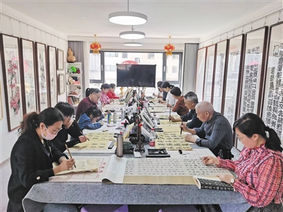 近日,记者走进杨云峰精心布置的墨香盈室。一进门,浓郁的文化气息扑面而来,墨香与画韵交织,营造出浓郁的艺术氛围。屋子中央,摆放着一张长长的桌子,桌面上整齐地摆放着笔墨纸砚,这正是学员们学习的主阵地。墙壁一侧的书架上摆满了各类书法、国画教材,以及艺术大家的作品集,方便学员们随时查阅、学习。公益书法班面向所有成人开放,吸引着不少居民前来品鉴、学习。