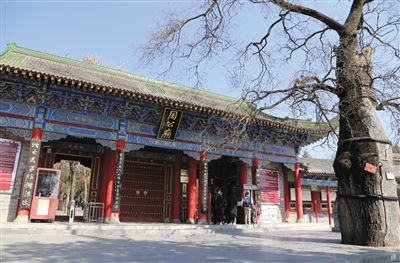 进入周公庙山门从古木下经过,前行就是乐楼。乐楼也称戏楼,始建于元代至元年间(1264—1294),明清重修后仍保持了元代建筑风格。乐楼正面悬挂横匾“飘风自南”。楼下为穿堂过庭,供行人通过,两边各立廊柱,形成廊殿。周公庙内还有两座戏楼,均为砖木结构,在古建群中轴线两侧并立。戏楼前有开阔的场地,可以想象重要的祭祀日,戏台前人头攒动,戏台上演员卖力表演,唱念做打,高昂的秦腔飞向空中,在很多的心中周人祖先也一定能够听到唱腔、感受到后人的虔诚。