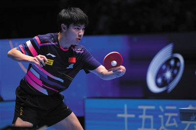 4月14日,中国选手黄友政在比赛中回球。