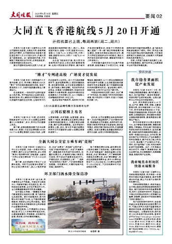 本报讯 (记者 孙露) 记者昨日从大同云冈国际机场获悉,为满足大同、香港两地居民出行需求,云冈国际机场与香港大湾区航空将于5月20日首次合作,开通大同直飞香港航线。这一新航线的开通,不仅缩短了两地间的出行时间,还将促进经贸、文旅等领域的交流与合作。