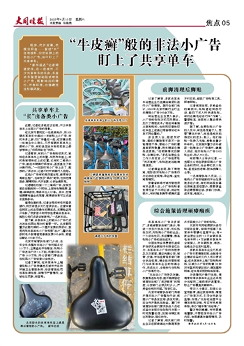 近期,记者在多地走访发现,不少共享单车上出现小广告的身影。