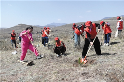 本报讯 (记者 孙露) 植一棵树,添一份绿。4月19日,大同博恩义工、明德社工、慈缘公益和新荣区心连心志愿者协会的150余名志愿者,在长城一号旅游公路新荣区助马堡村西山坡段开展“公益植树添新绿 同心扮靓助马堡”公益植树活动。