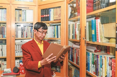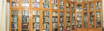 要说韩府的书房,得从客厅说起。一进他家门,迎面便是一堵3米多高的书墙——全部由书垒起,两侧还各有一组1米多宽的通头书柜。因为是读书人自己设计的,所以利用率极高。除了书之外,上下前后没有一点儿多余的空间。这可以视作韩府书房的序曲。