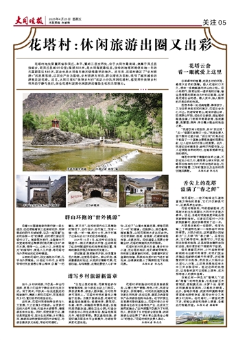 花塔村地处晋冀两省和灵丘、阜平、繁峙三县交界处,位于大同市最南端,隶属于灵丘县独峪乡,距灵丘县城90公里;海拔550米,是大同海拔最低点,独特的地理环境使当地一年的无霜期高达180天,因此也是大同每年春天绿得最早的地方。近年来,花塔村确定了“乡村旅游+”的发展思路,以农业产业为基础,乡村旅游为形态,群众增收为目标,吸引了越来越多的游客走进花塔。近日,大同日报社“美丽乡村行”采访小分队来到花塔村,感受那份美丽乡村带来的宁静与美好,体会花塔村发展休闲旅游的蓬勃生机和无限潜力。