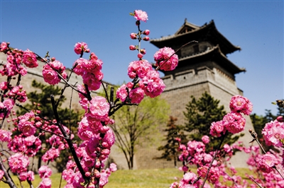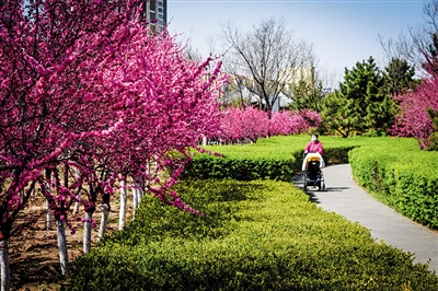 记者在城墙带状公园看到,榆叶梅花开正艳。在园林工人的巧手“梳妆”下,榆叶梅被修剪成不同的造型,与周边绿植相得益彰。榆叶梅开花量大,密密地聚集在枝条上,远远望去,似天边粉红色的云霞,驻足细观,有单瓣和重瓣之分,前者花朵小巧,仅一层花瓣;后者花朵硕大,花瓣层层叠叠,花色相对更深更艳。