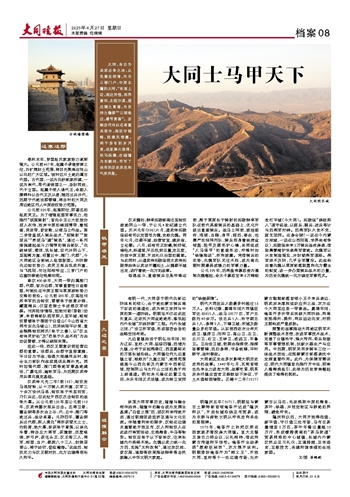 大同,自古为兵家必争之地,从先秦至明清,作为三晋门户、中原北疆的大同,“东连上谷,南达并恒,西界黄河,北控沙漠,居边隅之要害,为京师之藩屏”“三面临边,最号要害”。历朝历代均以名将重兵驻守,施攻守韬略,筑雄关奇塞。两千多年的岁月里,这里烽火连绵,铁马纵横,在碰撞与交融间,书写了独有的历史底色和气质风骨。