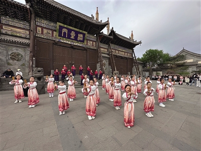 上午10时,大同府文庙门外古筝悠扬,5名身着传统服饰的演奏者以一曲《小美满》拉开活动序幕。灵动的旋律与朱檐碧瓦相映成趣,瞬间点燃节日氛围。随后,40名小演员以诗乐交融的《孔子》篇章,立体呈现孔子“仁礼”思想精髓。来自河北的张先生说:“孩子们用肢体语言演绎‘礼’的仪式感,这场演出让传统文化真正活起来了。”