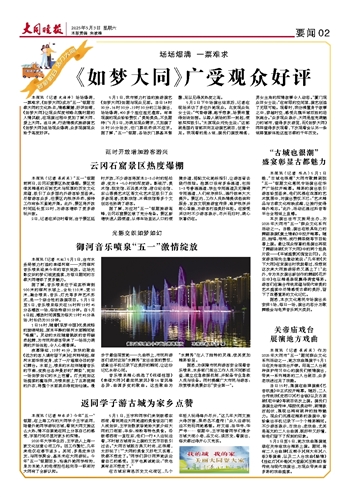 本报讯 (记者 双红) 5月1日,由市水务局倾力打造的幸福河湖——大同御河音乐喷泉迎来今年的首次绽放。这场光影交织的梦幻视觉盛宴,为假日期间的古都大同增添了更多魅力。