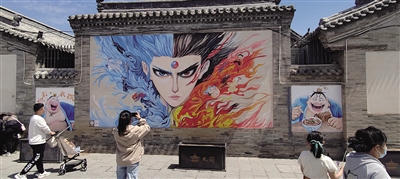 本报讯 (记者 辛雅君) 青砖灰瓦间,哪吒踩着风火轮“破壁而出”,敖丙的冰蓝色龙鳞在阳光下流转……从3月初一笔一画勾勒,3人团队合力创作,13幅《哪吒之魔童闹海》主题壁画让古城的一百米白墙变身国漫“画布”,成为“五一”期间新晋打卡地。