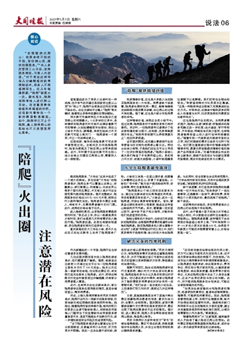 “在没有完善的法律法规的约束之前,双方可以通过书面形式约定权利义务,在不违反现有法律法规的前提下,约定有效。”北京市法大律师事务所专职律师郭淑勤表示,从陪爬者的角度来讲,存在服务争议、费用争议、责任划分等方面的风险,从雇佣者游客角度讲,存在服务质量、服务费等方面的争议,尤其在陪爬过程中发生了人身安全意外,还会产生责任承担与划分的问题。此外,对于提供陪爬服务的女性来说,可能还会面临被骚扰的风险。