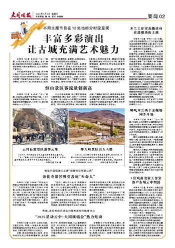 3日下午,大同府文庙前、县楼街等有北路梆子、耍孩儿的戏曲折子戏演出、变脸特技表演等,鼓楼西街有晋剧国潮表演,东南邑、柴市角等处有人物秀、器乐演奏等情景演绎,关帝庙戏台有阳高二人台演出。当晚,华严广场有市歌舞剧院“五一”假期文化惠民专场演出,独唱《手挽手》《山西姑娘》《美丽山西我的家》等,舞蹈《平城盛景》《舞彩缤纷》《花开云中》等,演员们倾情演绎,激昂的乐声与观众的掌声此起彼伏。