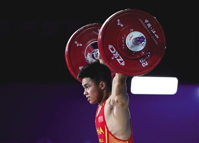 5月10日,中国选手王敏在比赛中。最终,他获得抓举、挺举、总成绩三项季军。