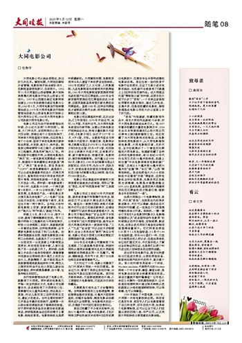 电影公司在鼎盛的时候,还办过杂志。《工作简报》,1970年开始出刊,油印,16开版,不定时出刊,为大同市电影系统首创内部刊物,主要以反映电影发行放映动态为主,附有少量的影片内容介绍;《电影介绍》,创办于1977年10月,4开8版,月报。主要是刊登当月排映影片内容简介、拍摄花絮、电影常识等;《银幕与观众》1978年12月由《电影介绍》改名出版,仍为4开8版,栏目除当日上映影片内容介绍,还有影评文章、新片摄制动态、拍摄花絮、电影知识、演员轶闻趣事等。发行量上过5000份/月;《影友》,1981年由《银幕与观众》改版而出,仍为月刊,先为16开,后改为32开,封面由套色封面改为简装封面。栏目大致与《银幕与观众》相同,每月发行3000册左右。
