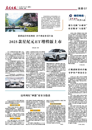 “作为奇瑞新能源产品矩阵中的核心车型,2025款星纪元ET增程版的上市是奇瑞星途品牌巩固中、高端新能源汽车市场的重要产品。”庞大汽车园区星途4S店店长王紫光表示,奇瑞星途品牌在全面升级新能源汽车配置的战略中按下了加速键,旨在以紧跟前沿科技潮流的产品,为消费者带来豪华与安全兼备的驾乘体验,刷新中、高端新能源汽车市场上的购车性价比认知。