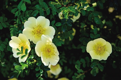 黄刺玫分为单瓣和重瓣品种,在我市园林绿化中,单瓣较为常见。御河生态园可以欣赏到重瓣黄刺玫,它的花朵比单瓣更大,又因花瓣颜色叠加,黄色更为明艳动人。无论是单瓣还是重瓣黄刺玫,开花后都会结出红彤彤的果实,挂满枝头,别具一番景致。