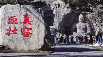 “凿石开山,因岩结构,真容巨壮,世法所希。”我们此行的第一站首先来到了昙曜五窟,昙曜五窟当时是由高僧昙曜主持开凿,象征北魏道武、明元、太武、景穆、文成五位皇帝的“帝佛合一”形象。这些佛像以山体为依托,与山比高,形体高大,如第20窟的露天大佛高13.7米,气势恢宏,体现了北魏王朝的强盛统治。