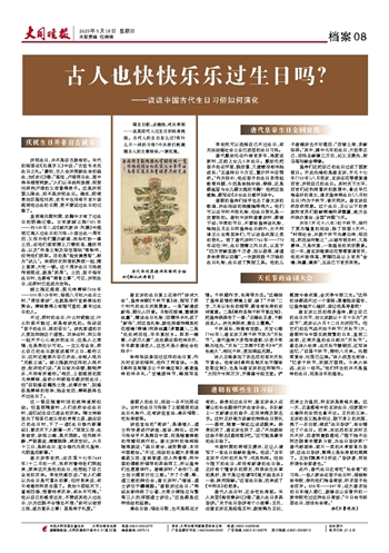庆祝生日,并不是自古就有的。宋代的陈淳在《北溪字义》中说:“古经书本无生日之礼。”最初,古人会庆贺新生命的诞生,如《史记》载:“高祖、卢绾同日生,里中持羊酒贺两家。”人们以羊肉和美酒,祝贺刘邦和卢绾的父母喜得贵子。这是庆祝婴儿降生,而不是庆祝生日。确实,即便贵如汉高祖刘邦,史书中也没有只言片语提到他出生的日期,更不要说过生日的记载了。