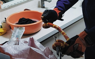 本报讯 (记者 龙中华) 17日,北辰花园南区24号楼一住户家中闯入不速之客,一条近两米长、黄白相间斑纹的蛇出现在卫生间,女主人发现后吓坏了,其丈夫迅速拨打119求助,消防员到场及时化解险情并将蛇妥善处置。