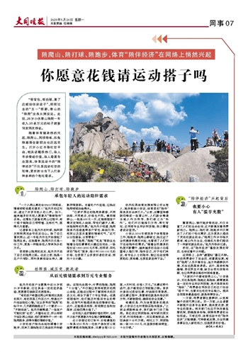 露营爬山、骑行跑步等活动,不仅丰富了人们的业余生活,还不断激发着消费新活力。陪爬山、陪打球、陪跑步不仅满足了人们的个性化需求,还为更多人提供了灵活的就业机会。“陪爬工作并非每天都有,难以作为主业,但确实为我们提供了一种新的就业机会。”赵丹丹告诉记者。